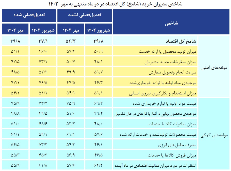 به گزارش "گسترش تولید و تجارت" شاخص مدیران خرید اقتصاد (شامخ) در مهرماه ۱۴۰۳، گرچه برای ششمین ماه متوالی زیر ۵۰ ثبت شده است؛ اما شتاب افت آن کمتر شده و بهویژه در بخش صنعت با رشد تامین برق، شرایط مساعدتری پیدا کرده است.البته به عقیده بسیاری از بنگاهها به دلیل قطعیهای مکرر برق در ماههای گذشته، تولید کارخانهها در رکود عمیقی قرار داشته و در ظرفیتهای بسیار پایین خود فعالیت داشتند، بنگاهها شرایط را بهطور نسبی در مقایسه با رکود شهریورماه بهتر ارزیابی کردهاند.
