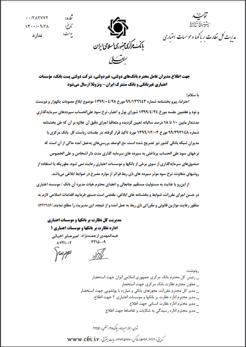 بانک مرکزی در بخشنامهای خطاب به بانکها و موسسات اعتباری بر رعایت نرخ سود سپرده مصوب شورای پول و اعتبار تاکید کرد.