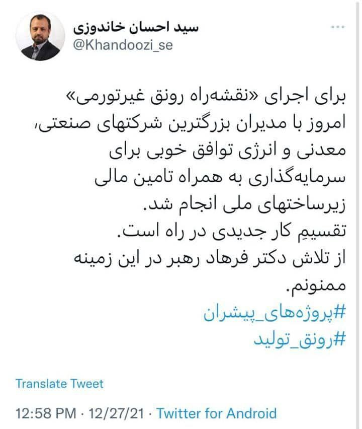 وزیر اقتصاد نوشته است: برای اجرای نقشه راه رونق غیر تورمی امروز با مدیران بزرگترین شرکتهای صنعتی، معدنی و انرژی، توافق خوبی برای سرمایهگذاری به همراه تامین مالی زیرساخت های ملی انجام شد؛ تقسیم کار جدیدی در راه است./فارس