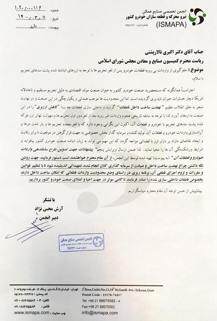 به گزارش "گسترش تولید و تجارت" آرش محبینژاد در نامه خود خطاب به عزتالله اکبری تالارپشتی- رئیس کمیسیون صنایع و معادن مجلس شورای اسلامی- با موضوع جلوگیری از واردات بیرویه قطعات خودرو پس از لغو تحریمها، آورده است: