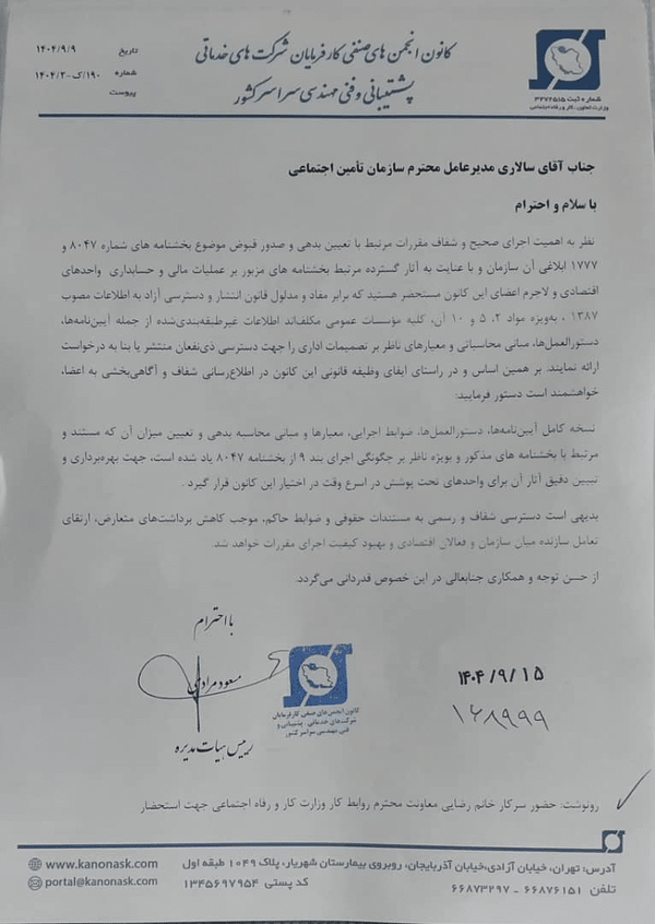 آقای سالاری مدیرعامل سازمان تامین اجتماعی، نظر به اهمیت اجرای صحیح و شفاف مقررات مرتبط با تعیین بدهی و صدور قبوض موضوع بخشنامه های شماره ۸۰۴۷ و ۱۷۷۷ ابلاغی آن سازمان و با عنایت به آثار گسترده مرتبط بخشنامه های مزبور بر عملیات مالی و حسابداری واحدهای اقتصادی و لاجرم اعضای این کانون مستحضر هستید که برابر مفاد و مدلول قانون انتشار و دسترسی آزاد به اطلاعات مصوب ۱۳۸۷ ، بهویژه مواد ۲، ۵ و ۱۰ آن، کلیه موسسات عمومی مکلفاند اطلاعات غیرطبقهبندیشده از جمله *آییننامهها، دستورالعملها، مبانی محاسباتی و معیارهای ناظر بر تصمیمات اداری* را جهت دسترسی ذینفعان منتشر یا بنا به درخواست ارائه نمایند. بر این اساس و در راستای ایفای وظیفه قانونی این کانون در اطلاعرسانی شفاف و آگاهیبخشی به اعضا، خواهشمند است دستور فرمایید: نسخه کامل آییننامهها، دستورالعملها، ضوابط اجرایی، معیارها و مبانی محاسبه بدهی و تعیین میزان آن که مستند و مرتبط با بخشنامه های مذکور و بویژه ناظر بر چگونگی اجرای بند ۹ از بخشنامه ۸۰۴۷ یاد شده است، جهت بهرهبرداری و تبیین دقیق آثار آن برای واحدهای تحت پوشش در اسرع وقت در اختیار این کانون قرار گیرد.