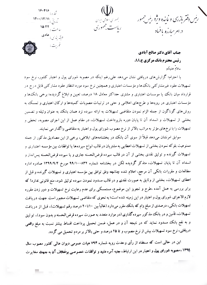 «جناب آقای دکتر صالح آبادی ریاست محترم بانک مرکزی
