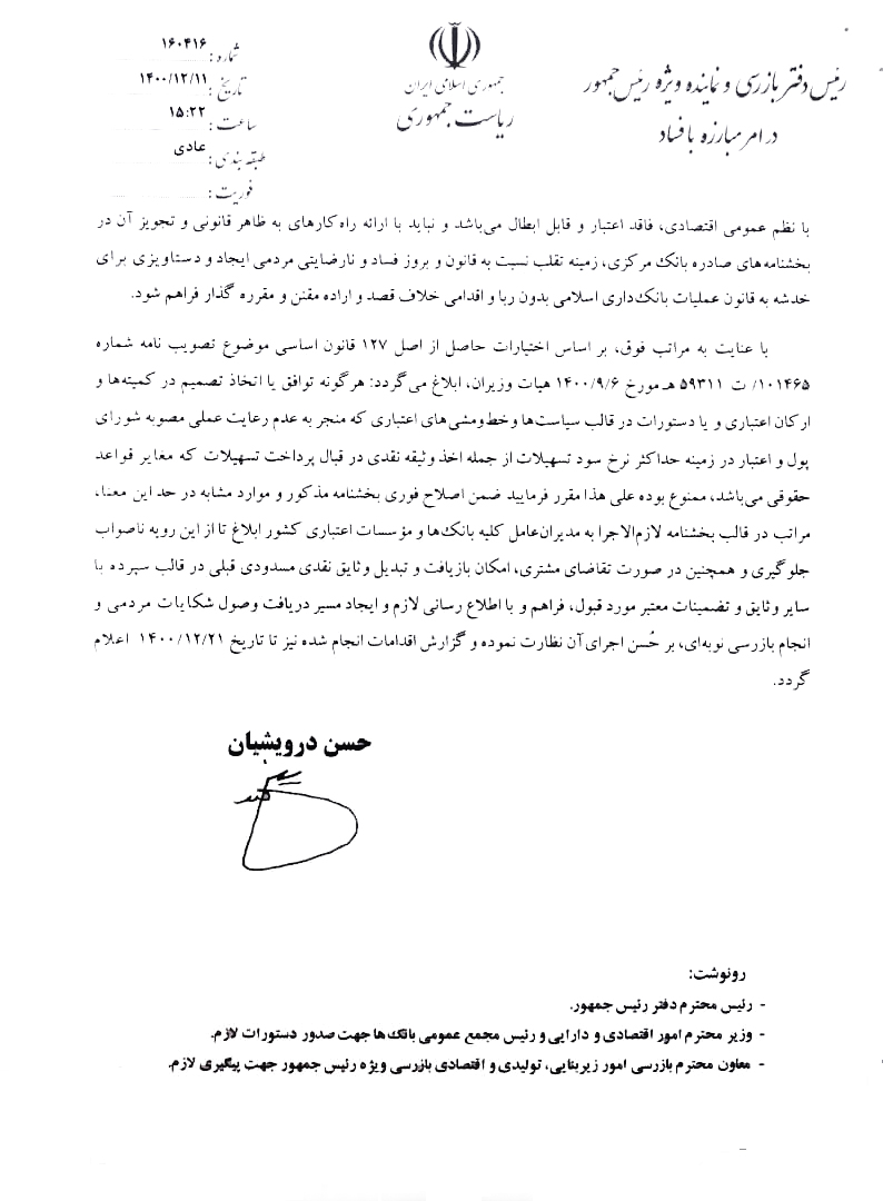 با عنایت به مراتب فوق و بر اساس اختیارات حاصل از اصل ۱۲۷ قانون اساسی موضوع تصویب نامه شماره ۱۰۱۴۶۵/ت ۵۹۳۱۱ هـ مورخ ۶/۹/۱۴۰۰ مصوب هیات وزیران، ابلاغ میگردد: هرگونه توافق یا اتخاذ تصمیم در کمیتهها و ارکان اعتباری و یا دستورات در قالب سیاستها و خط مشیهای اعتباری که منجر به عدم رعایت عملی مصوبه شورای پول و اعتبار در زمینه حداکثر نرخ سود تسهیلات از جمله اخذ وثیقه نقدی در قبال پرداخت تسهیلات که مغایر قواعد حقوقی میباشد ممنوع بوده و علی هذا مقرر فرمایید ضمن اصلاح فوری بخشنامه مذکور و موارد مشابه در حد این معنی مراتب در قالب بخشنامهای لازم الاجرا به مدیران عامل کلیه بانکها و موسسات اعتباری کشور ابلاغ تا از این رویه ناصواب جلوگیری و همچنین در صورت تقاضای مشتری، امکان بازیافت و تبدیل وثایق نقدی مسدودی قبلی در قالب سپرده با سایر وثایق و تضمینات معتبر مورد قبول، فراهم و با اطلاع رسانی لازم و ایجاد مسیر دریافت وصول شکایات مردمی و انجام بازرسی نوبهای بر حسن اجرای آن نظارت نموده و گزارش اقدامات انجام شده نیز تا تاریخ ۲۱/۱۲/۱۴۰۰ اعلام گردد.» باشگاه خبرنگاران جوان