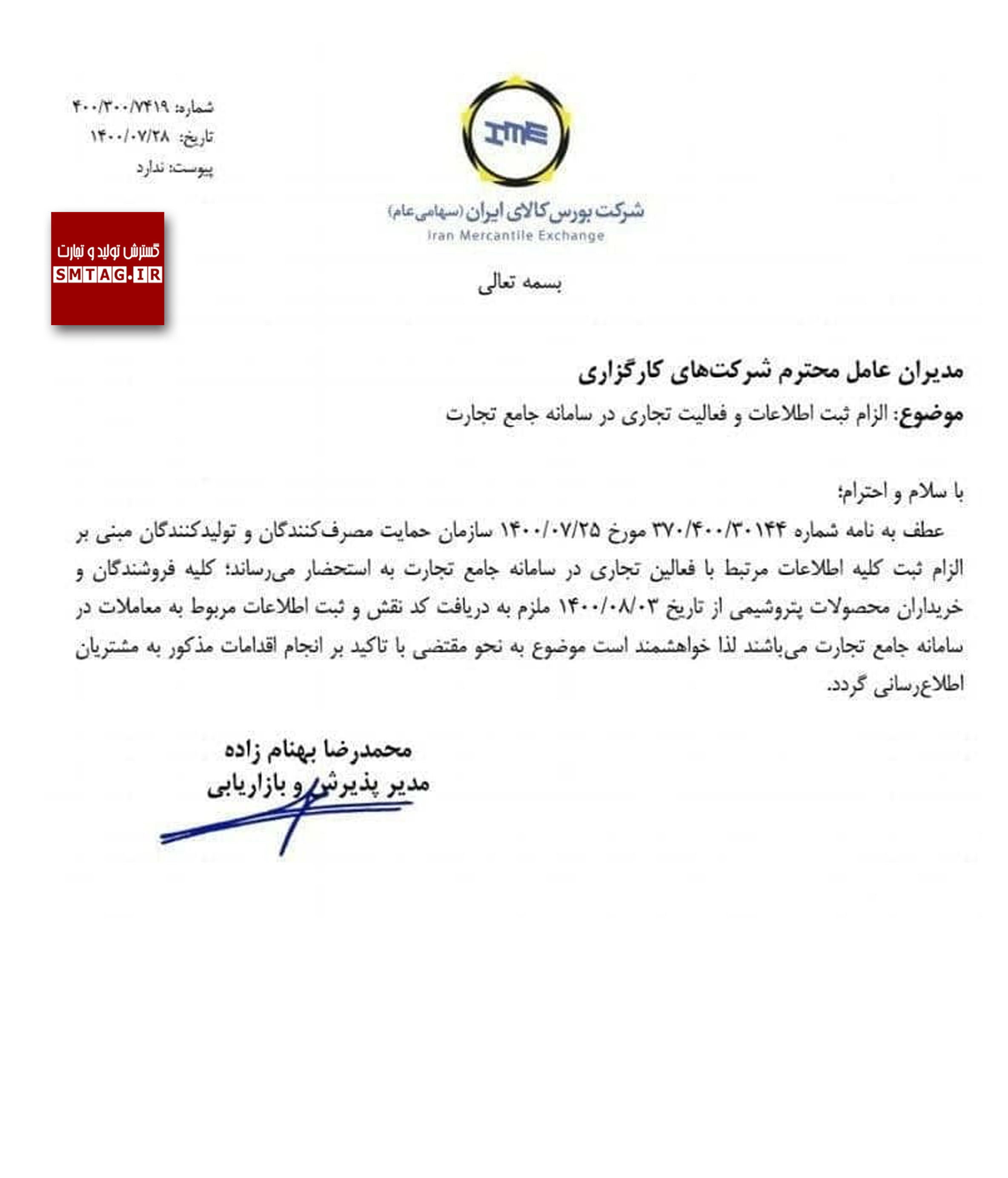 عطف به نامه شماره 370/400/30144 مورخ 1400/07/25 سازمان حمایت مصرف کنندگان و تولیدکنندگان مبنی بر الزام ثبت کلیه اطلاعات مرتبط با فعالین تجاری در سامانه جامع تجارت به استحضار می رساند؛ کلیه فروشندگان و خریداران محصولات پتروشیمی از تاریخ 1400/08/03 ملزم به دریافت کد نقش و ثبت اطلاعات مربوط به معاملات در سامانه جامع تجارت می باشند. لذا خواهشمند است موضوع به نحو مقتضی با تاکید بر انجام اقدامات مذکور به مشتریان اطلاع رسانی گردد.