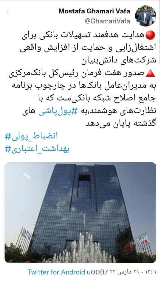 مصطفی قمریوفا، مدیر روابط عمومی بانک مرکزی در توئیتی با هشتگ انضباط مالی و بهداشت اعتباری نوشت: هدایت هدفمند تسهیلات بانکی برای اشتغال آفرینی پایدار و حمایت از افزایش واقعی شرکتهای دانشبنیان در دستور کار بانک مرکزی قرار گرفت.