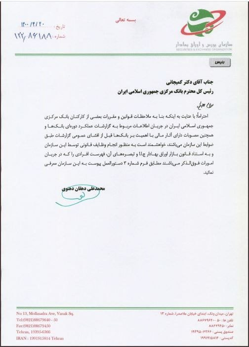 رئیس سازمان بورس در نامه ای به رئیس بانک مرکزی خواستار اعلام اسامی آن دسته از کارکنان بانک مرکزی که به صورت های مالی بانک ها قبل از اعلام عمومی دسترسی دارند، شد.